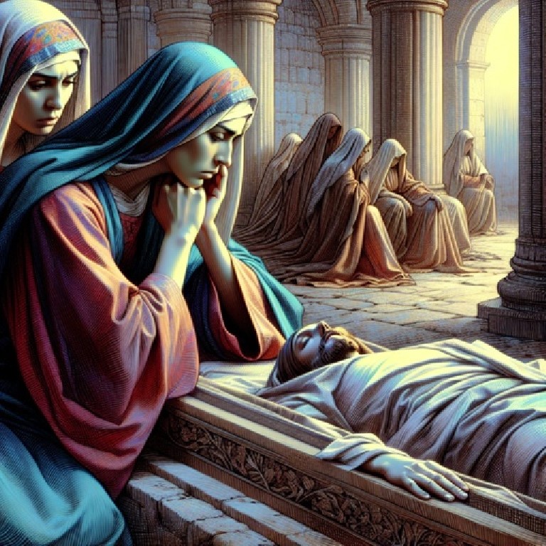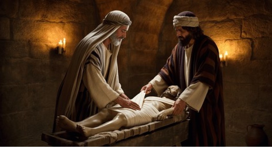 Matthew 27:57-61 When the even was come, there came a rich man of Arimathaea, named Joseph, who also himself was Jesus’ disciple: He went to Pilate, and begged the body of Jesus. Then Pilate commanded the body to be delivered.And when Joseph had taken the body, he wrapped it in a clean linen cloth, And laid it in his own new tomb, which he had hewn out in the rock: and he rolled a great stone to the door of the sepulchre, and departed. And there was Mary Magdalene, and the other Mary, sitting over against the sepulchre.